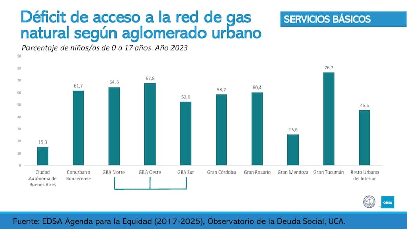 Otro de los ejes de gravedad en la situación de infancia se da en el déficit de acceso a la red de cloacas y red de gas que afecta al 37,7% y al 53,4%, respectivamente.