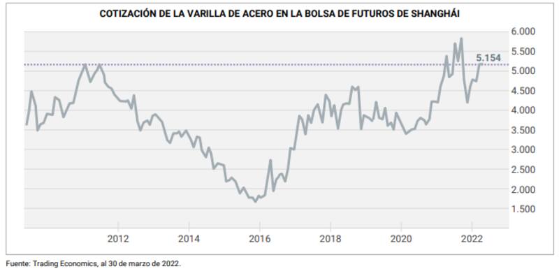 El acero se está negociando en el mercado de Shanghái a 5150 yuanes por tonelada, a niveles de 2012. Los futuros de las varillas de este metal a principios de 2020 cotizaban 3400 yuanes por tonelada, según detalló el último informe del Centro de Estudios para la Producción (CEP XXI) del Ministerio de Desarrollo Productivo.