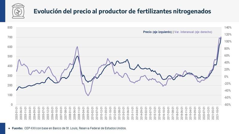 En este contexto, se sumó un shock en el precio de la energía con el barril de crudo Brent que supera los u$s 100 y una suba récord en la historia de los fertilizantes con precios un 37% por encima del último máximo en septiembre de 2008, materia prima esencial para la producción de alimentos.
