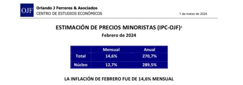 Según los datos proyectados por el Centro de Estudios Económicos de la consultoraOFJ, en febrero el IPC mensual se mantendría en 14,6%, mientras que anualmente llegaría a 270,7%.