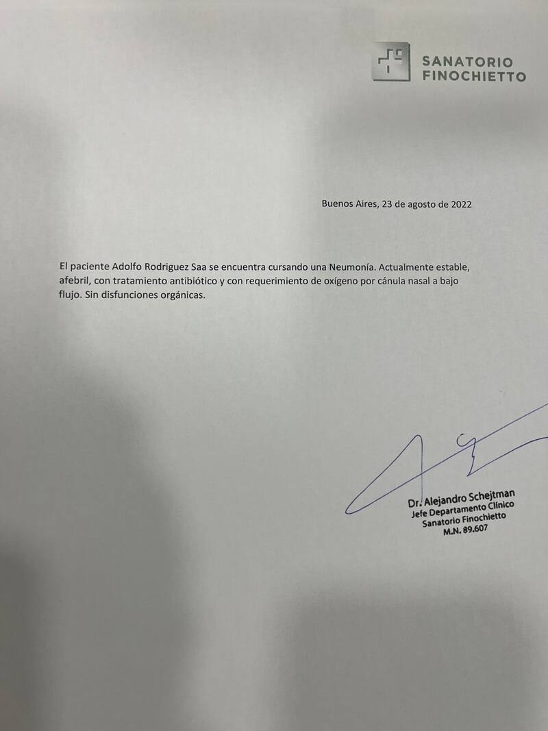 "El paciente Adolfo Rodríguez Saá se encuentra cursando una neumonía. Actualmente estable, afebril, con tratamiento antibiótico y con requerimiento de oxígeno por cánula nasal a bajo flujo. Sin disfunciones orgánicas", señala el documento que lleva la firma del doctor Alejandro Schejtman, jefe del Departamento Clínico del Sanatorio Finochietto.