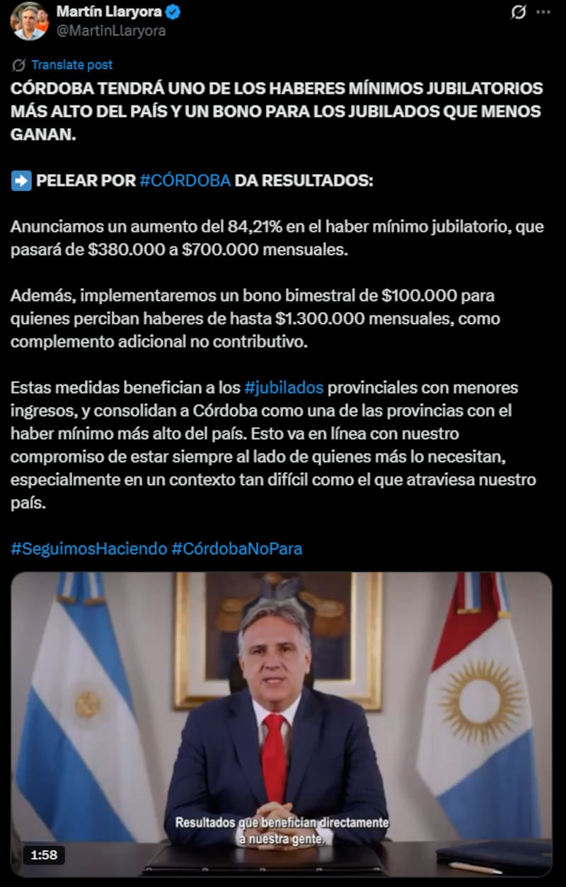 Además del incremento en el haber mínimo, el mandatario cordobés también informó la implementación de un bono bimestral de $ 100.000 para todos los jubilados que perciban haberes de hasta $ 1.300.000 mensuales, como complemento adicional no contributivo que llega directamente a los sectores más vulnerables.