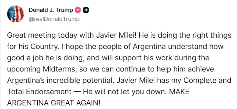 "¡Excelente reunión la de hoy con Javier Milei! Está haciendo lo correcto por su país. Espero que el pueblo argentino comprenda su excelente labor y que la apoye durante las próximas elecciones intermedias para que podamos seguir ayudándolo a alcanzar el increíble potencial de Argentina. Javier Milei tiene mi total apoyo. ¡No te dejará down. HACER ARGENTINA GRANDE DE NUEVO!", posteó el mandatario de los Estados Unidos en un intento por alejar la incertidumbre.