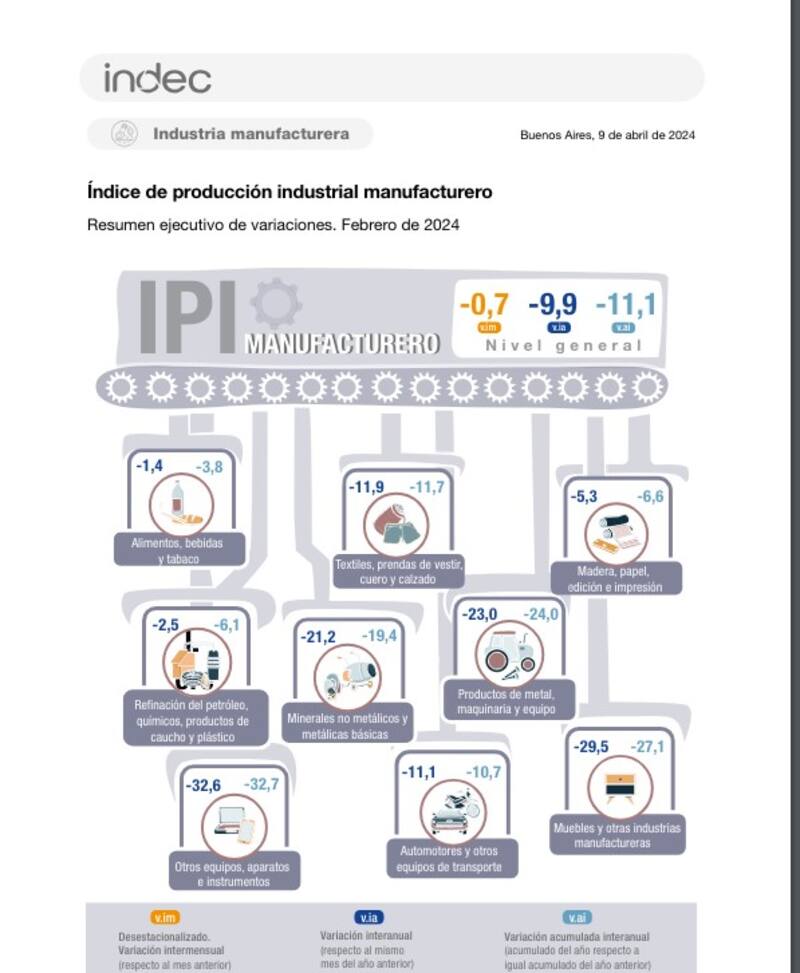 En febrero, el Índice de producción industrial manufacturero (IPI manufacturero) mostró una caída de 9,9% respecto a igual mes de 2023, informó esta tarde el INDEC . El acumulado del primer bimestre de 2024 presenta una disminución de 11,1% respecto a igual período de 2023, añade el ente de estadísticas oficial.