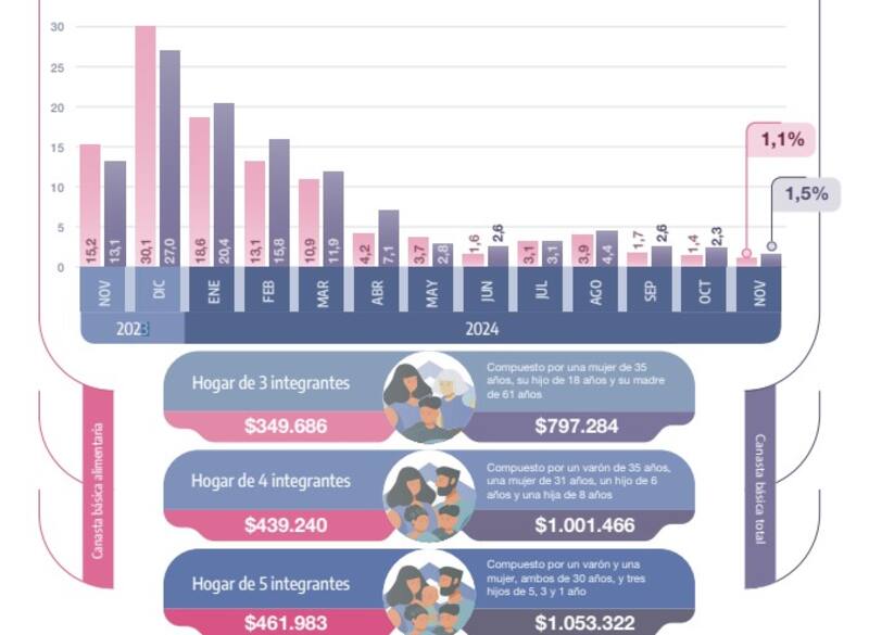 La canasta básica (CBT) de noviembre subió el 1,5% con respecto al mes anterior y una familia tipo necesitó $ 1.001.466 para no caer en la pobreza, según los datos difundidos este miércoles por el Indec.