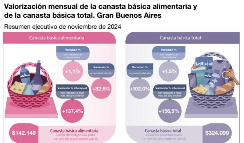 Esto resultó en variaciones interanuales del 137,4% (en el caso de la canasta básica alimentaria); y de 156,5% si se evalúa la canasta básica total.