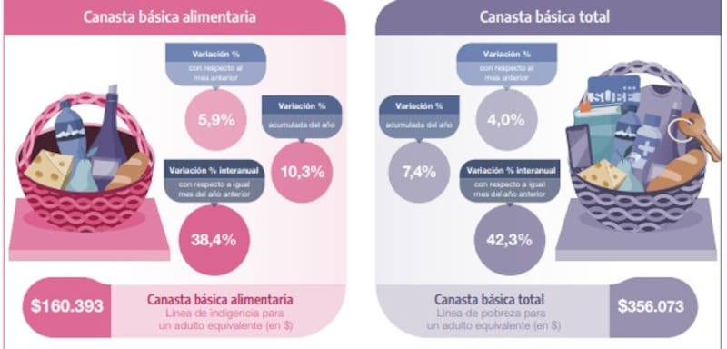 Este último dato se desprende de la Canasta Básica Alimentaria (CBA), indicadorque determina la línea de la indigencia y que cerró en 5,9%. En la variación acumulada del año, la CBT tuvo un incremento del 7,4% y la alimentaria, un 10,3 por ciento.