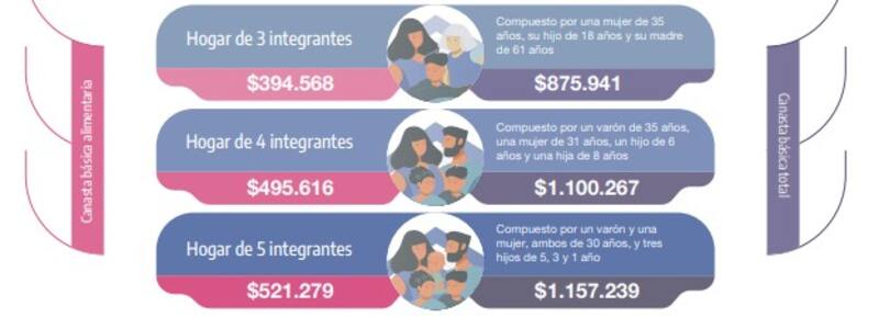 Por su parte, una familia tipo de cuatro individuos (un varón de 35 años, una mujer de 31, un hijo de 6 y una hija de 8) necesitó $ 1.100.267 para no convertirse en pobre, y $ 495.616 para no traspasar el umbral de la indigencia.