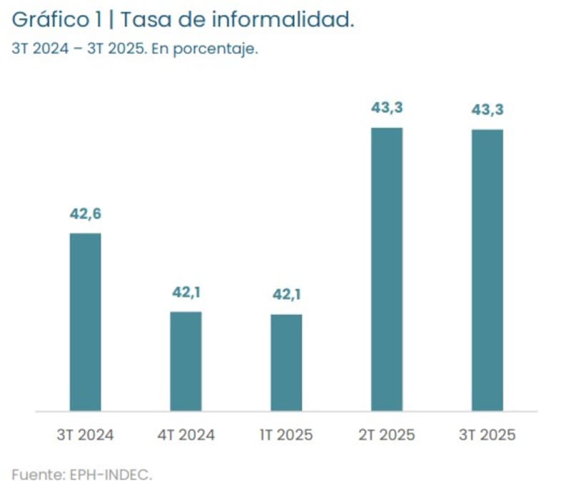 El panorama general tampoco es alentador. El 43,3% del total de los trabajadores del país se encuentra en la informalidad, lo que significa que 4 de cada 10 empleos no están cubiertos por la legislación laboral, impositiva o de la seguridad social.
