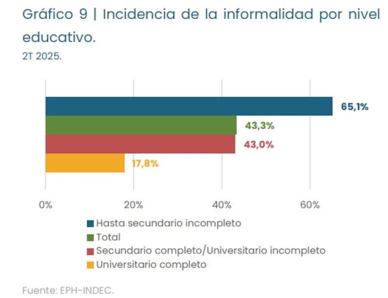 Los trabajadores con título universitario registran una tasa de apenas 17,8%, mientras que aquellos con nivel educativo intermedio (secundario completo o universitario incompleto) llegan al 43%. El número se dispara al 65,1% entre quienes no completaron la escuela secundaria.