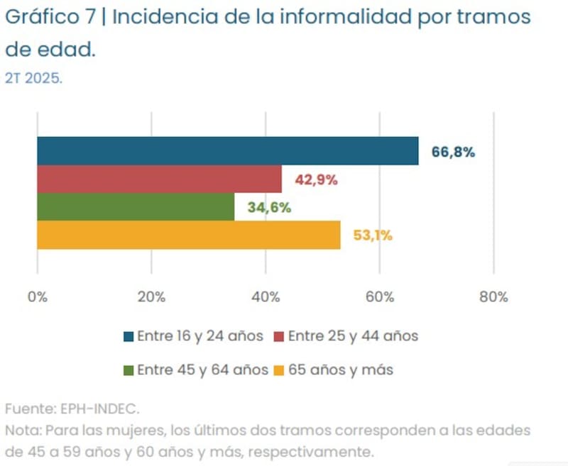 Le sigue el grupo de entre 25 y 44 años con un 42,9%, y luego aquellos de 65 años en adelante (60 para las mujeres) con un 53,1%. La curva dibuja una U: alta informalidad en los extremos de la vida laboral, menor protección en el medio.