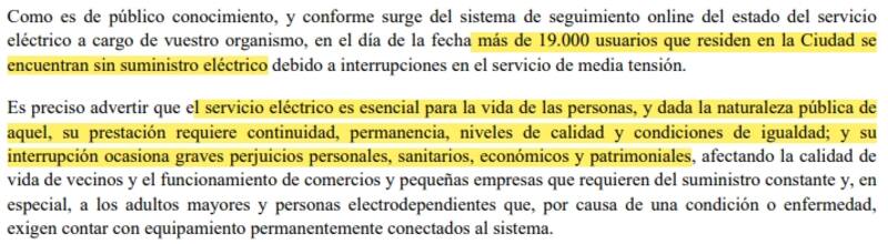 "Es preciso advertir que el servicio eléctrico es esencial para la vida de las personas" y "su interrupción ocasiona graves perjuicios personales, sanitarios, económicos y patrimoniales, afectando la calidad de vida de vecinos y el funcionamiento de comercios", dice la carta dirigida a Edesur y el ENRE firmada por Zaballa.