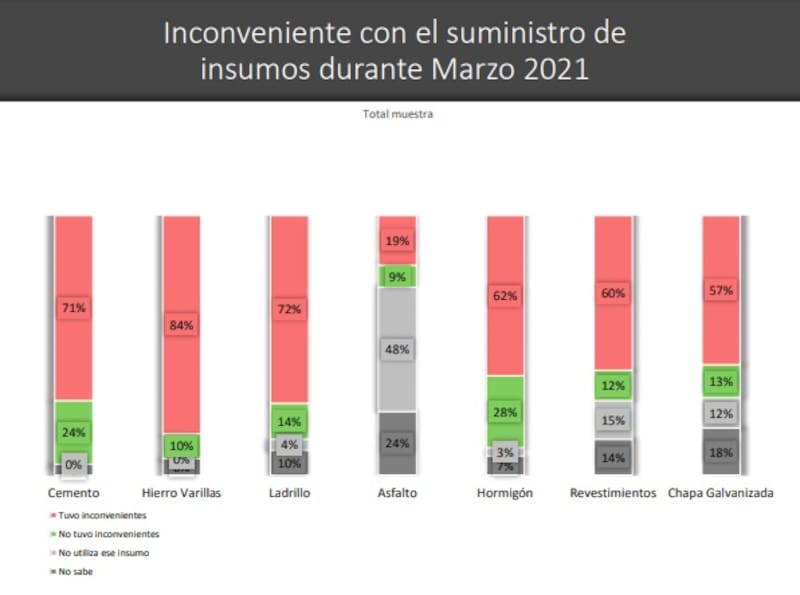 Esto se da en un escenario en el que la gran mayoría de las empresas manifiesta haber tenido inconvenientes con el abastecimiento de insumos, que alcanzan al 84% del total de empresas en el caso de varillas de hierro, el 71% en la provisión de cemento y al 72% en ladrillo.