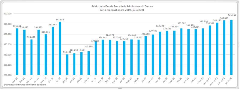 La deuda pública bruta de la Argentina llegó en julio al equivalente a u$s 343.894 millones, un nuevo récord nominal, y registró un salto mensual de u$s 374 millones.
