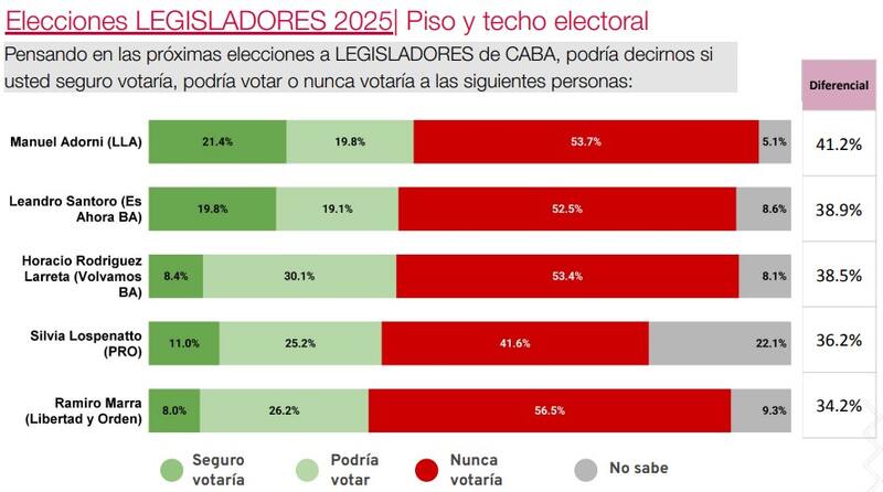 La encuesta también mide el "piso y el techo electoral" de cada uno de los postulantes, es decir a quién "seguro votaría", a quién "podría votar" y a quién "nunca votaría". Manuel Adorni es el que tiene más opciones positivas con 21,4% entre quienes lo votarían "seguro" y 19,8% de quienes lo consideran como opción.
