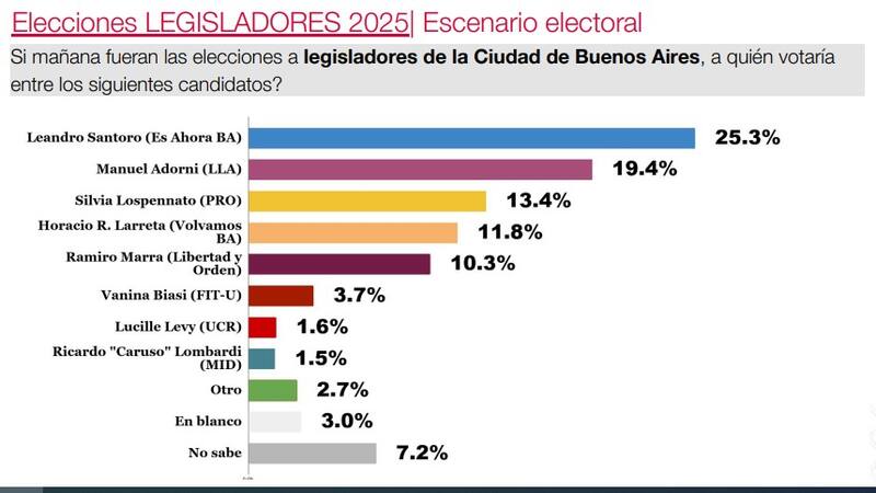 De acuerdo a una encuesta de la consultora CB, "si mañana fueran las elecciones a legisladores de la Ciudad de Buenos Aires", Leandro Santoro de Es Ahora Buenos Aires (la versión local del peronismo) alcanzaría el 25,3%, seguido por Manuel Adorni, vocero presidencial y cabeza de lista de LLA, con 19,4%.
