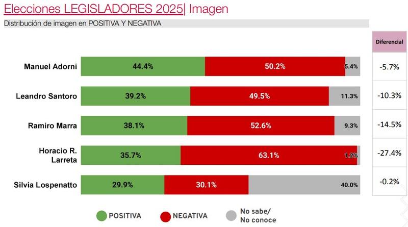 El estudio también tiene en cuenta la imagen de cada uno de los postulantes, y su diferencial entre las respuestas positivas y negativas. En este punto, Adorni tiene un 44,4,%% de imagen positiva, contra un 50,2% de imagen negativa lo que da un diferencial de -5,7%.