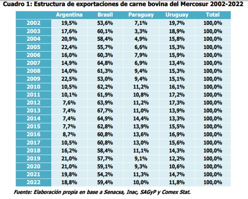 El estudio muestra que la Argentina alcanzó un pico de ventas de carne bovina al exterior con 396.000 toneladas, al igual que Brasil (630.000 toneladas) y Paraguay (334.000 toneladas), mientras que los envíos de Uruguay se ubicaron levemente por detrás de los valores observados en 2021.