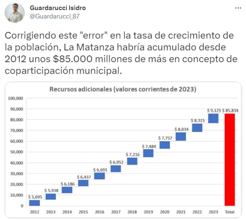 Otro de los especialistas que detectaron este "error" del Censo 2010 fue Isidro Guardarucci, economista asociado de la consultora FIEL, que calculó que el distrito bonaerense "habría acumulado desde 2012 unos $ 85.000 millones de más en concepto de coparticipación municipal" en pesos constantes a 2023.
