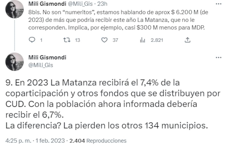 "En 2023 La Matanza recibirá el 7,4% de la coparticipación y otros fondos que se distribuyen por CUD (Coeficiente Único de Distribución). Con la población ahora informada debería recibir el 6,7%. ¿La diferencia? La pierden los otros 134 municipios", sostuvo la economista Milagros Gismondi.