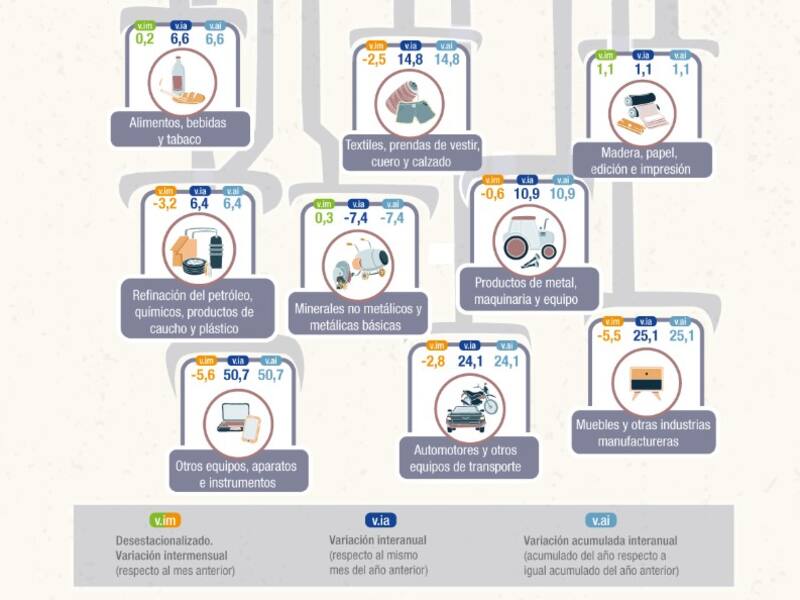 En orden a su incidencia en el nivel general, se registraron subas en "Alimentos y bebidas", 6,5%; "Sustancias y productos químicos", 10,5%; "Maquinaria y equipo", 28,5%; "Otros equipos, aparatos e instrumentos", 50,7%; "Prendas de vestir, cuero y calzado", 24,9%; "Vehículos automotores, carrocerías, remolques y autopartes", 23,2%; "Muebles y colchones, y otras industrias manufactureras", 25,1%.