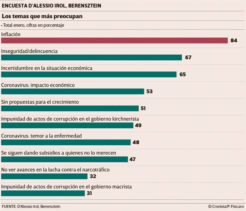 "La inflación se consolida como la principal preocupación para los argentinos en enero de 2021 y es secundada por la inseguridad. Ambas aumentan 5 puntos porcentuales respecto de diciembre, pasando de 79% a 84% y de 62% a 67%, respectivamente. El tercer puesto es para la incertidumbre por la situación económica, que preocupa al 65% de los consultados", señaló Sergio Berensztein, a la hora de analizar las respuestas de los 1264 adultos consultados en todo el país.