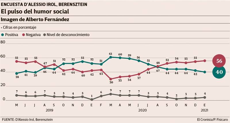 Al respecto, Berensztein resaltó que en la revisión de los resultados que arrojó el último Monitor, se observó que entre los consultados "persiste la inconformidad con la gestión del gobierno nacional, alcanzando su valor más alto desde diciembre de 2019: 58%", y acotó que, "lógicamente, esto repercute en la imagen del presidente Alberto Fernández, que obtiene 40% de imagen positiva y 56% de negativa, la más alta desde mayo de 2019".