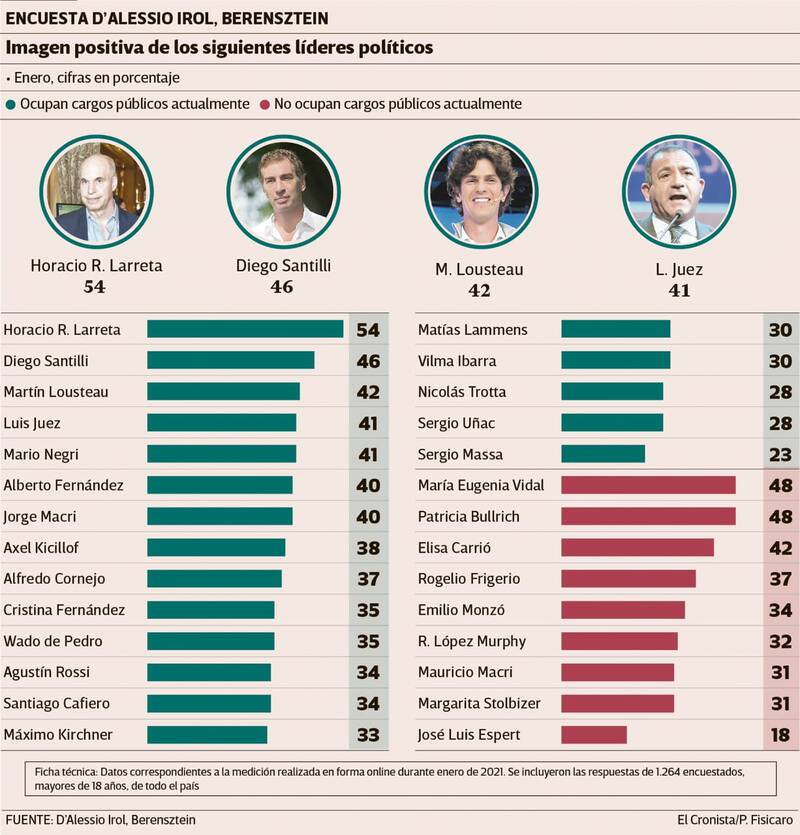 En cambio, "Horacio Rodríguez Larreta sigue liderando el ranking de imagen positiva con 54% y es el único de los 34 dirigentes medidos que supera el 50% de aprobación y obtiene un amplio balance positivo ya que su imagen negativa es de 39%. El segundo puesto es compartido por María Eugenia Vidal y Patricia Bullrich, con 48%", remarcó Berensztein, y agregó que "la gran mayoría de las figuras oficialistas no logran superar el tercio de aprobación, a excepción del Presidente y el gobernador bonaerense Axel Kicillof".