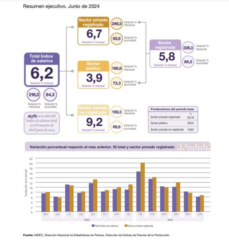 En junio de 2024, el Índice de salarios se incrementó 6,2% mensual y 216,3% interanual, informó esta tarde el Indec. El indicador acumula una suba de 84,3% respecto de diciembre previo. El crecimiento mensual se debe a subas de 6,7% en el sector privado registrado, 3,9% en el sector público y 9,2% en el sector privado no registrado.