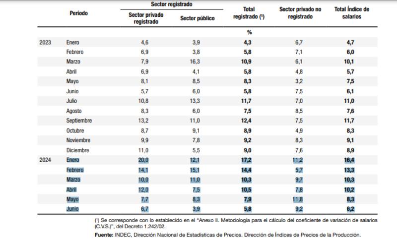 La suba de junio mostró una declinación en relación al registro de mayo, que fue de 8,3%. Los salarios de junio, sin embargo, estuvieron por arriba de la inflación del mismo mes, que fue de 4,6%, con tendencia declinante.