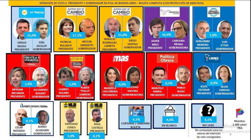 La consultora midió también la intención de voto de los candidatos a gobernador en la provincia de Buenos Aires, con una particularidad: como suele haber un arrastre de la boleta presidencial, midió el "dúo" entre el candidato a presidente y el de gobernador.