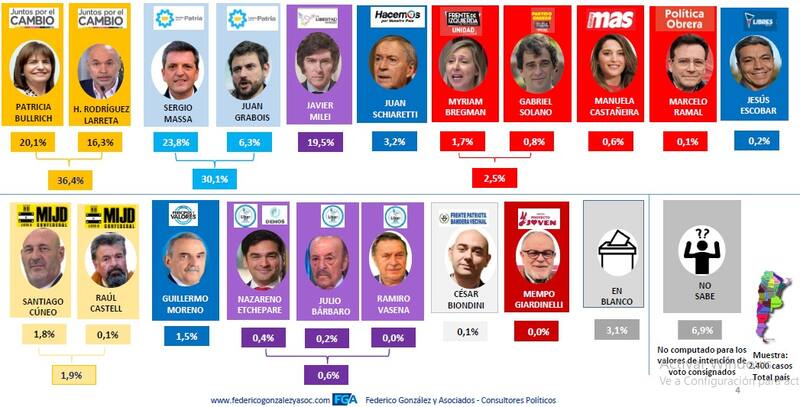 De darse el resultado que pronostica Federico González & Asociados en su última encuesta, los candidatos a presidente para las elecciones generales del 22 de octubre serían Sergio Massa, por UP, Patricia Bullrich, por Juntos por el Cambio, Javier Milei (LLA), Juan Schiaretti (Hacemos por una Nueva Argentina), Myriam Bregman por el FIT y la sorpresa de la inclusión de Guillermo Moreno y Santiago Cuneo, ya que ambos alcanzarían el 1,5% de votos válidos para superar el umbral establecido por las PASO.