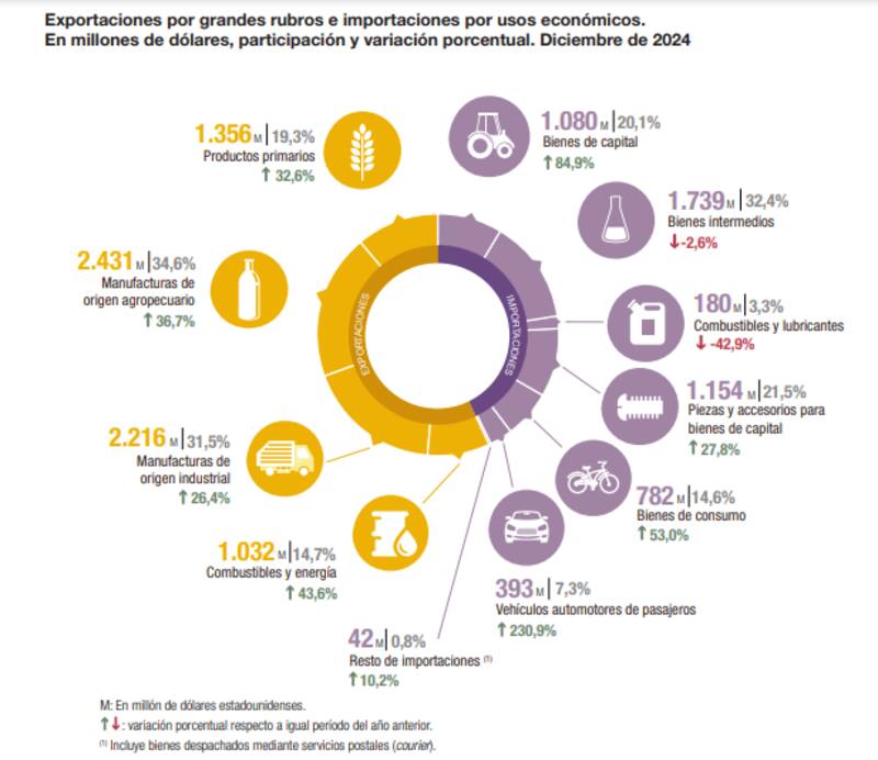 Según las proyecciones de Abeceb en 2025 las exportaciones seguirán traccionando con un alza de 7%, de la mano de una buena cosecha y ventas del sector energético mientras que las importaciones también mostrarían un gran dinamismo, incluso superior al 16%, "en línea con la recuperación económica, la mayor apertura comercial, desregulación, baja de aranceles y apreciación cambiaria".