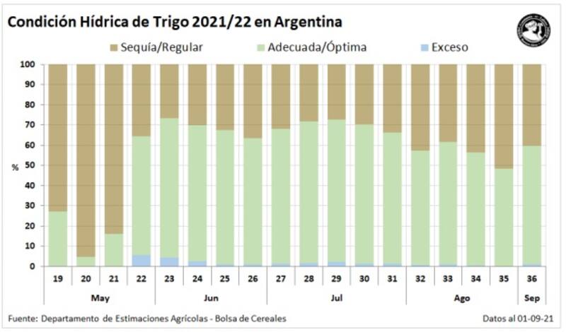 Con estas lluvias el 58,9% del área estimada de trigo se encuentra bajo condición hídrica adecuada-óptima, esto representa 10,5 puntos porcentuales por encima de la semana anterior.