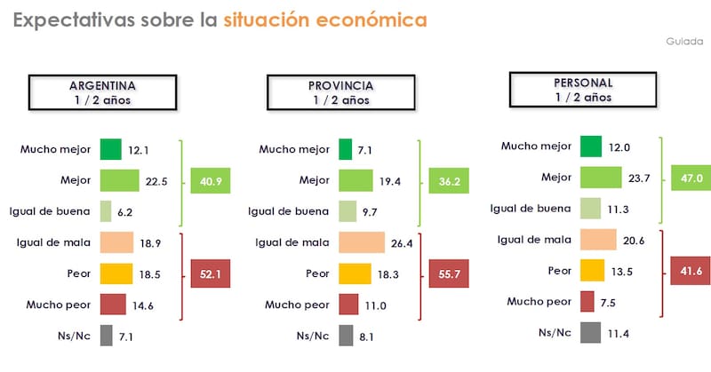 El termómetro social explica parte de ese panorama. A nivel nacional, 52,1% de los encuestados cree que la situación económica será peor o mucho peor en uno o dos años, y en la provincia el pesimismo se eleva al 55,7%. Incluso en el plano personal, el 41,6% espera estar igual de mal o peor. El deterioro en las expectativas se proyecta directamente sobre la percepción de la gestión presidencial: Milei alcanza apenas 38,1% de imagen positiva contra 59,5% de negativa, con una diferencia negativa de 21,4 puntos.