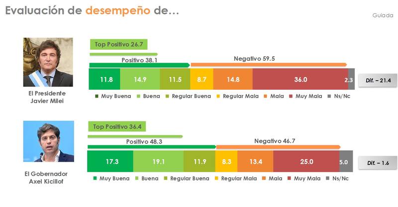 El contraste con el gobernador Axel Kicillof es notorio: si bien divide opiniones, logra 48,3% de positiva y 46,7% de negativa, quedando en terreno de equilibrio. En el territorio bonaerense, donde se jugará gran parte del capital político del Gobierno, Kicillof aparece mejor posicionado que Milei en la evaluación ciudadana, lo que refuerza el escenario cuesta arriba para el oficialismo.