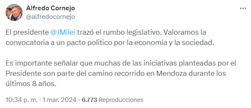 En tanto que Alfredo Cornejo, gobernador de Mendoza, también se expresó en la mencionada red social. "El presidente Javier Milei trazó el rumbo legislativo. Valoramos la convocatoria a un pacto político por la economía y la sociedad", afirmó.