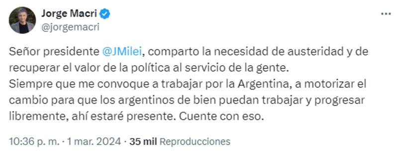 Asimismo el jefe de Gobierno porteño, Jorge Macri, se expresó en su perfil de X (ex Twitter): "Señor presidente Javier Milei, comparto la necesidad de austeridad y de recuperar el valor de la política al servicio de la gente".