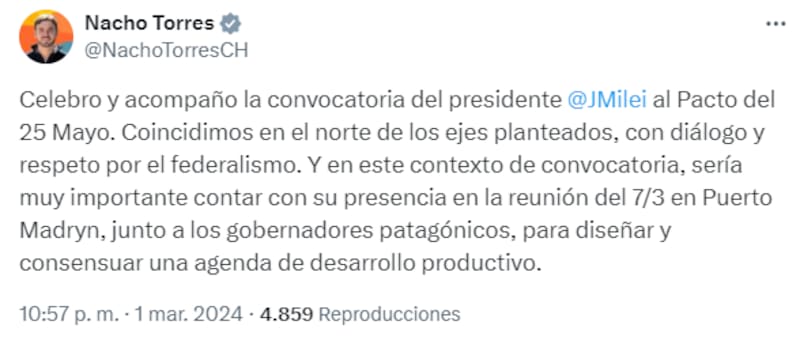"Celebro y acompaño la convocatoria del presidente Javier Milei al Pacto del 25 Mayo. Coincidimos en el norte de los ejes planteados, con diálogo y respeto por el federalismo", dijo Torres en su cuenta de X.