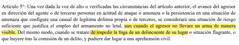Además señala que "el avance del agresor en dirección del agente o de terceras personas en actitud de ataque o amenaza", se considerará una situación de riesgo suficiente que justifica el empleo del armamento no letal, "aun cuando el agresor no llevare un arma de manera visible".