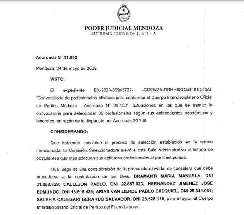 La Suprema Corte de Justicia de Mendoza dispuso por acordada 31.082 laintegración del "Cuerpo Interdisciplinario Oficial de Peritos del Fuero Laboral", según lo establecido por la Ley 27.348 de 2017, con la incorporación de 5 profesionales médicos.