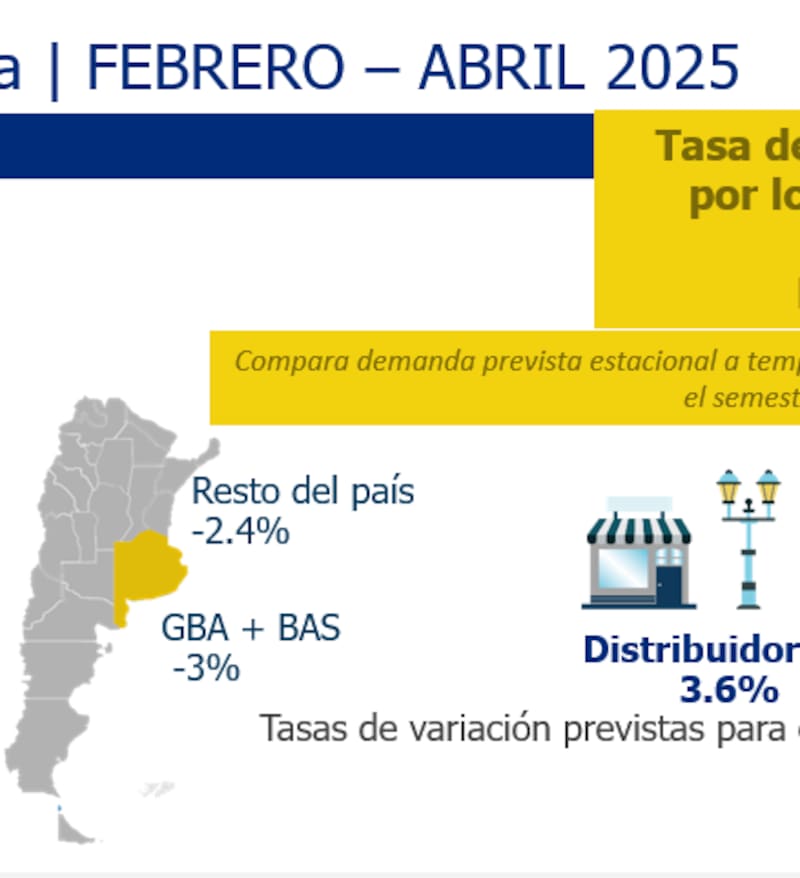 Los distribuidores -los que llevan electricidad a los hogares y comercios- registrarían una caída en su demanda del 3,6%, mientras que las grandes industrias consumirían un 3,6%, según la estimación de Cammesa.