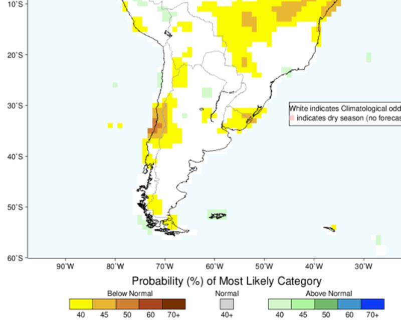 En un mapa que muestra toda la Argentina, la mayoría del país parece encaminarse -según esta predicción- a una temperatura "normal" para estos meses. Solo habría posibilidades que el termómetro se comporte un 40% por debajo de lo esperado en algunas zonas de Tierra del Fuego, Santa Cruz, Mendoza, San Juan y algunos bolsones de Buenos Aires, Santa Fe y Entre Ríos.