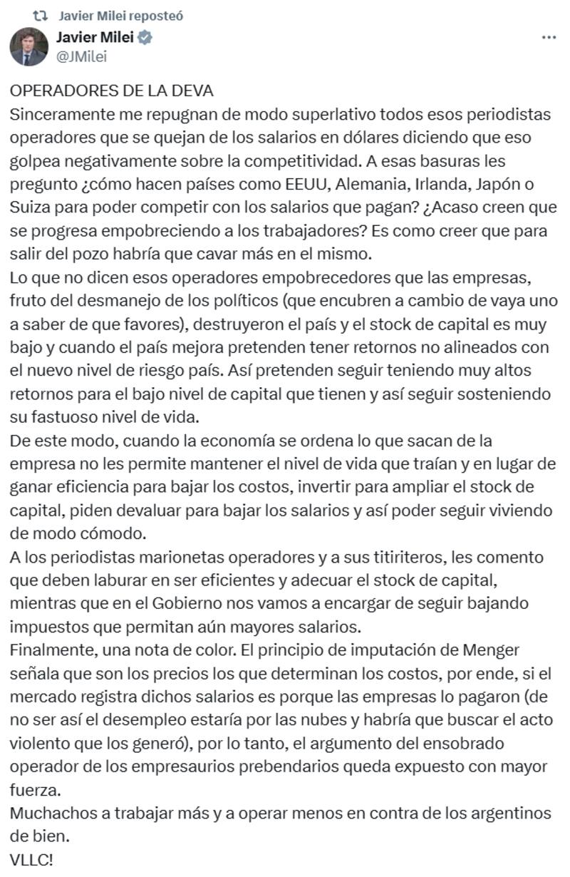 A través de su perfil de X (ex Twitter) agregó: "De este modo, cuando la economía se ordena lo que sacan de la empresa no les permite mantener el nivel de vida que traían y en lugar de ganar eficiencia para bajar los costos, invertir para ampliar el stock de capital, piden devaluar para bajar los salarios y así poder seguir viviendo de modo cómodo".