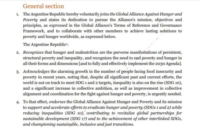 Como sello final, en esa aclaración, Argentina esgrime que "los diferentes objetivos de esa Agenda pueden contradecirse entre sí, siendo la lucha contra la crisis económica la desigualdad es contraproducente para la lucha contra el hambre y la pobreza".