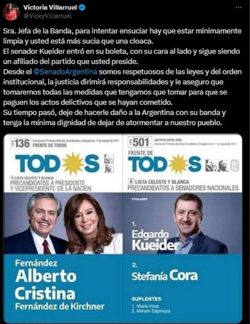 La noticia provocó que el kirchnerismo salga a tomar distancia del senador. En efecto, Cristina Kirchner apuntó contra Victoria Villarruel por designar a Kueider como Presidente de la Comisión de Asuntos Constitucionales del Senado.