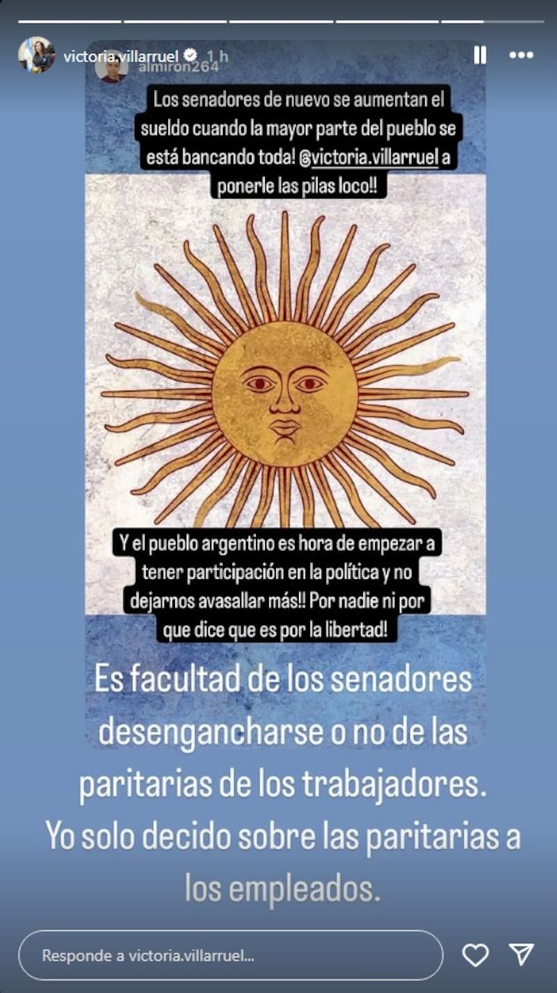 Por su parte, la vicepresidenta Victoria Villarruel y presidenta del Senado, subió a sus historias de instagram un posteo con el que contestó una critica de otro usuario: "Es facultad de los senadores desengancharse o no de las paritarias de los trabajadores. Yo solo decido sobre las paritarias a los empleados", dijo la vice, en respuesta a un usuario que la arrobó con el siguiente comentario: "Los senadores de nuevo se aumentan el sueldo cuando la mayor parte del pueblo se está bancando toda! @victoria.villarruel a ponerle las pilas loco!!