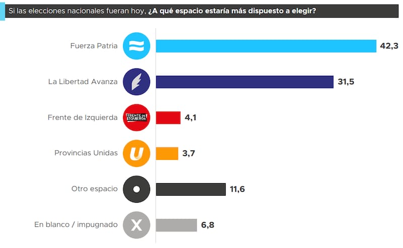 En la provincia de Buenos Aires, la tendencia general se invierte. En el distrito más poblado del país, Fuerza Patria tiene un 42,3% de intención de voto, mientras que La Libertad Avanza tiene un 31,5%. Frente de Izquierda se queda con un 4,1% y Provincias Unidas con 3,7%, en tanto un 11,6% elige otro espacio y un 6,8% votaría en blanco o impugnaría su voto.