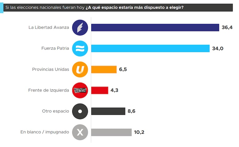 A nivel nacional, La Libertad Avanza se mantiene al frente con una intención de voto del 36,4%, seguida muy de cerca por Fuerza Patria, que suma un 34%. En tercer lugar aparece Provincias Unidas, el espacio que promueven varios gobernadores -entre ellos Martín Llaryora y Maximiliano Pullaro-, con 6,5%, mientras que el Frente de Izquierda alcanza 4,3%.