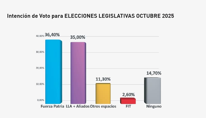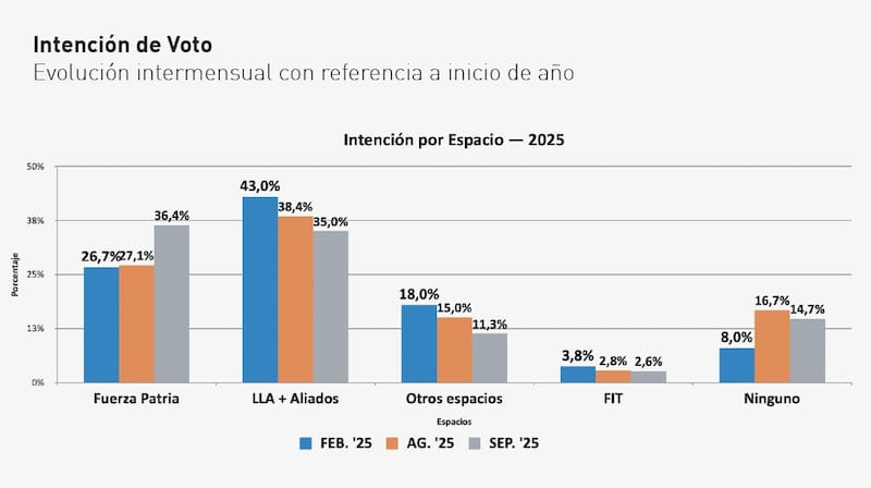 En términos de intención de voto, la encuesta registra un empate técnico con leve ventaja para Fuerza Patria, que en septiembre creció más de 9 puntos respecto de agosto. En contraste, La Libertad Avanza retrocedió 3,4 puntos, un descenso que no puede explicarse únicamente por los audios, pero que encuentra allí un catalizador.